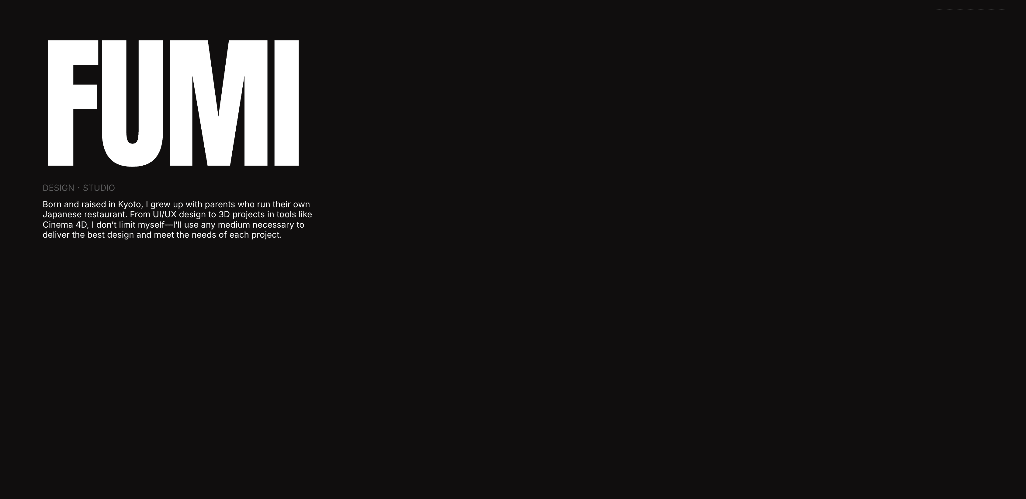 Born and raised in Kyoto, I grew up with parents who run their own Japanese restaurant. From UI/UX design to 3D projects in tools like Cinema 4D, I don’t limit myself—I’ll use any medium necessary to deliver the best design and meet the needs of each project.