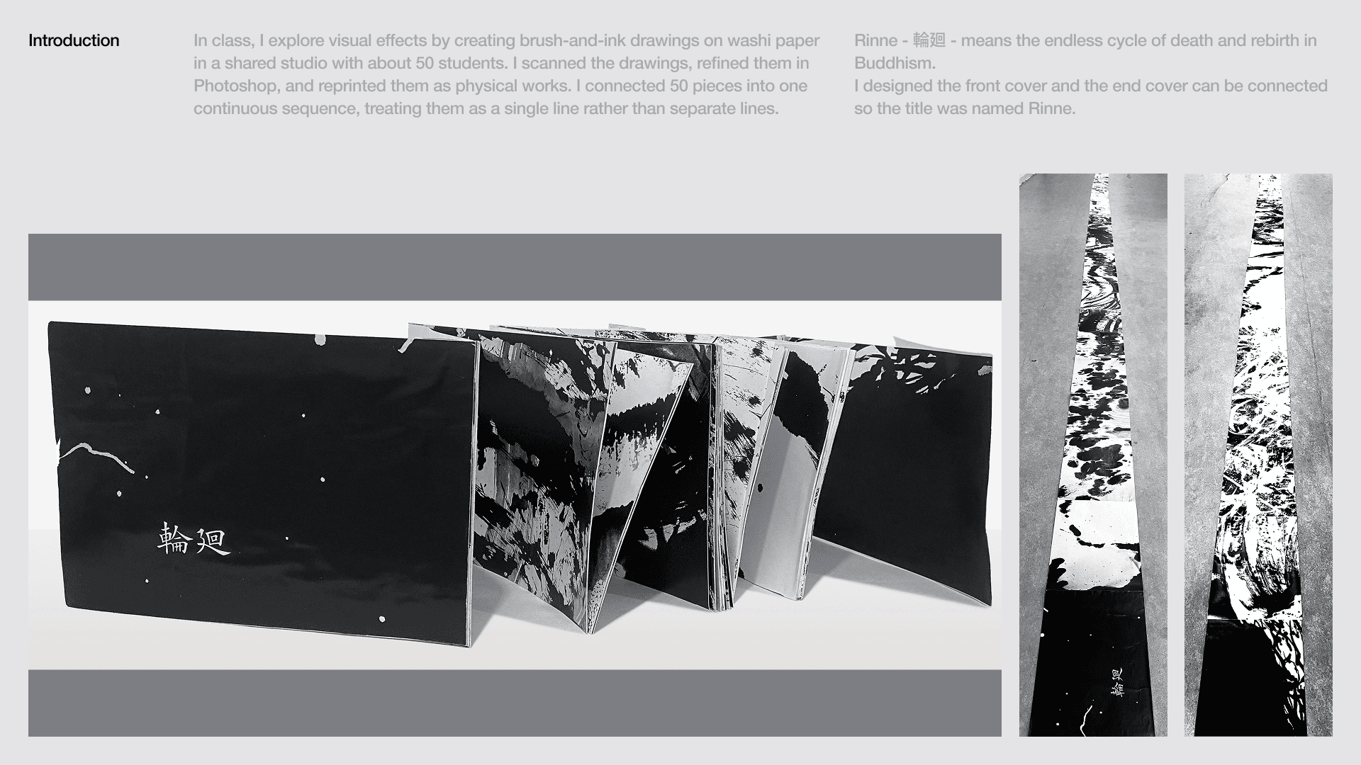 In class, I explore visual effects by creating brush-and-ink drawings on washi paper in a shared studio with about 50 students. I scanned the drawings, refined them in Photoshop, and reprinted them as physical works. I connected 50 pieces into one continuous sequence, treating them as a single line rather than separate lines.