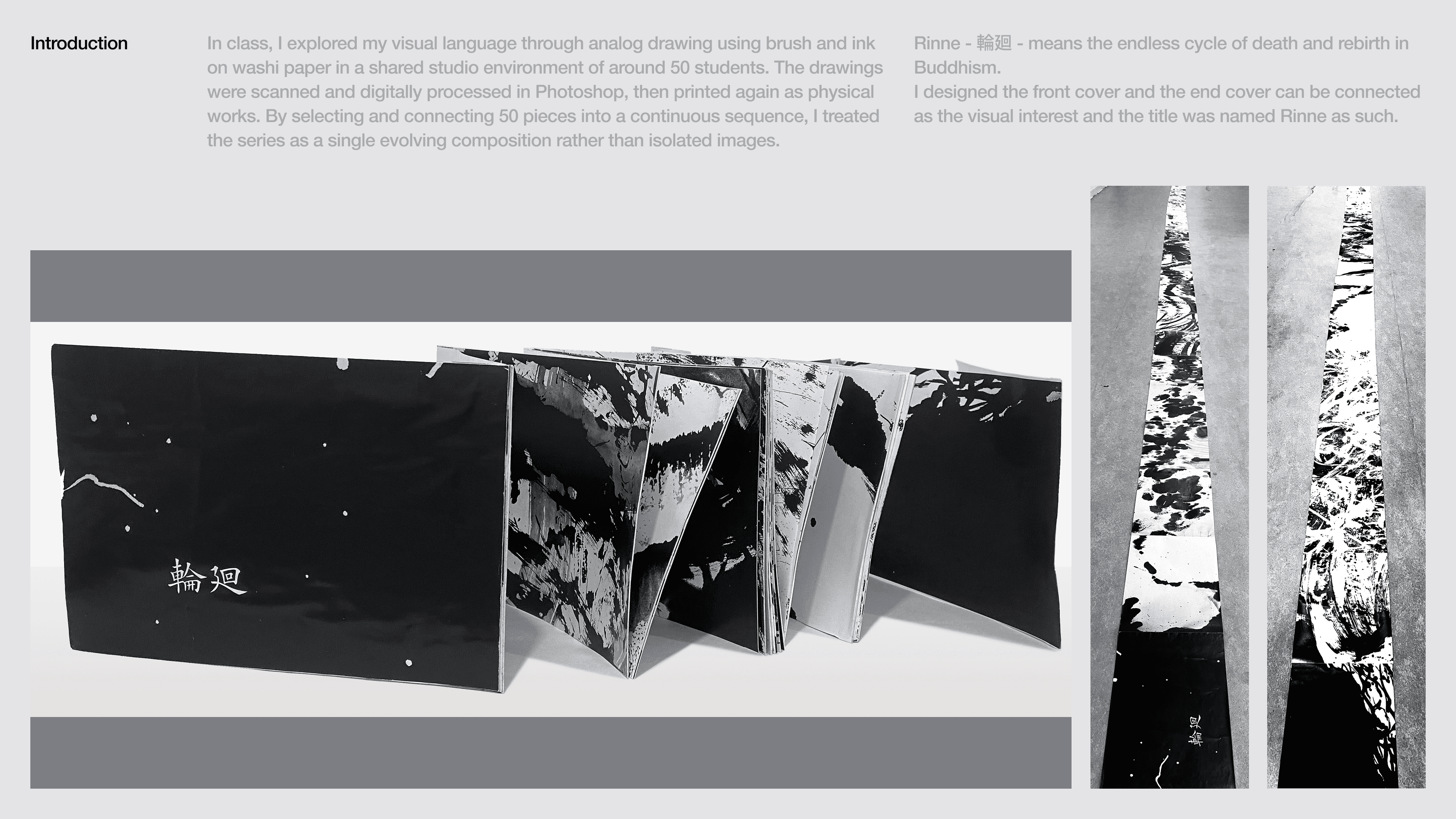In class, I explored my visual language through analog drawing using brush and ink on washi paper in a shared studio environment of around 50 students. The drawings were scanned and digitally processed in Photoshop, then printed again as physical works. By selecting and connecting 50 pieces into a continuous sequence, I treated the series as a single evolving composition rather than isolated images.